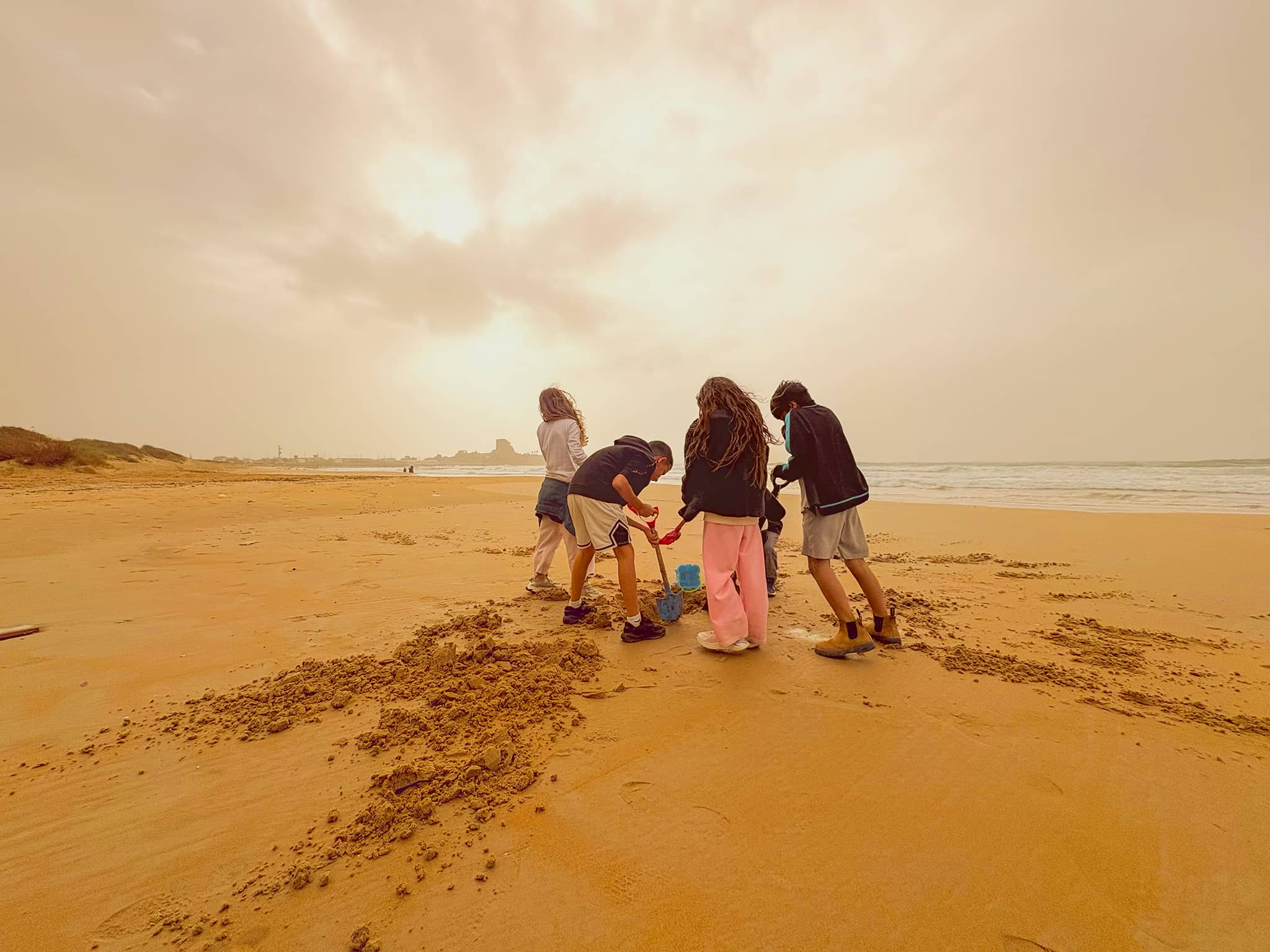 הם גררו חול הצידה, אולי מתוך ניסיון להבין איך נראתה הסירה הזו פעם, אך עבורם זה לא היה יום של אובך או נתוני זיהום אוויר, אלא עוד שבת על החוף עם אוצר קטן שמתגלה מתוך החול.